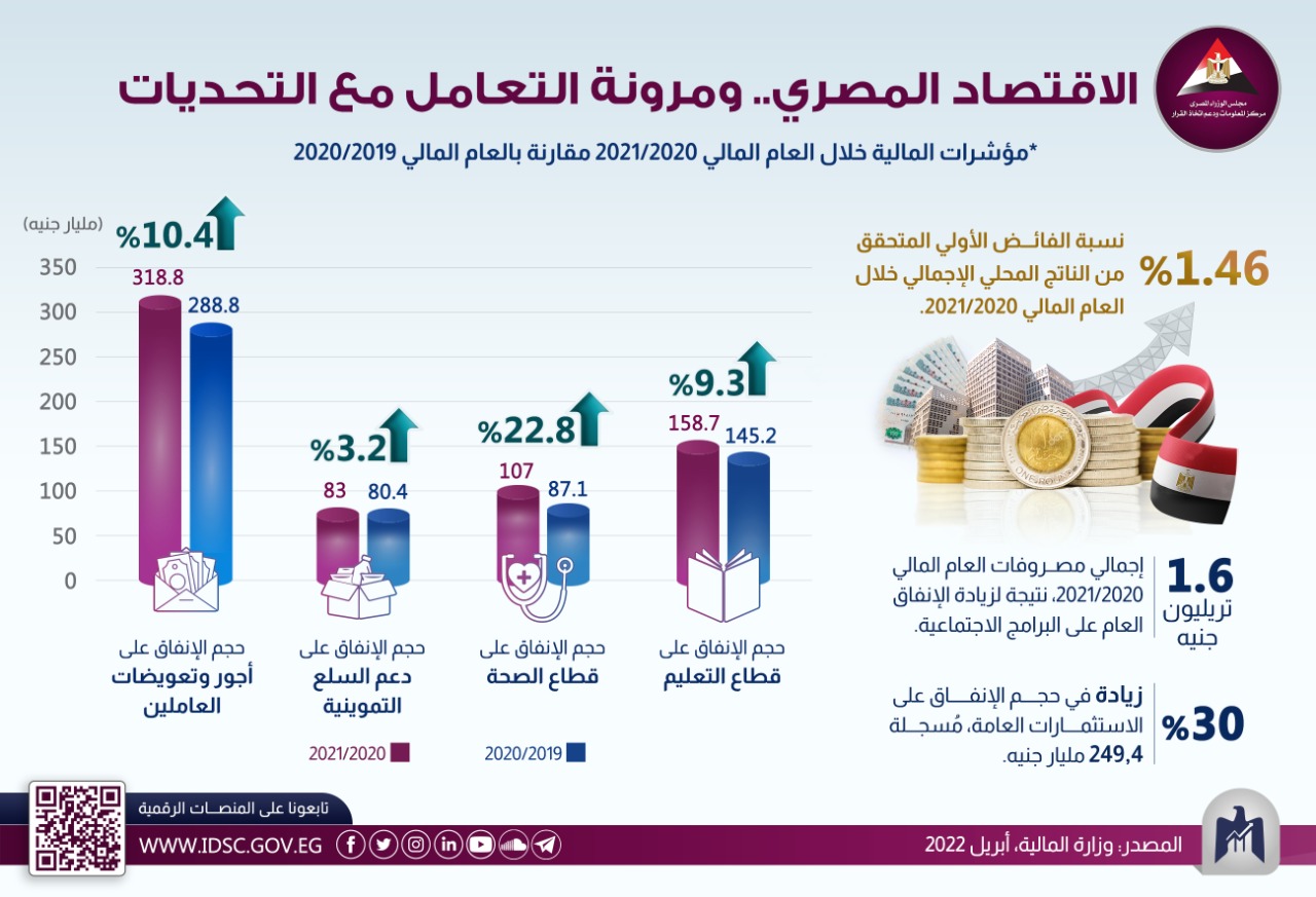 وأثبت الاقتصاد المصري قدرته على مواجهة التحديات، بمرونة لا مثيل لها؛ حيث نجح في تحقيق فائض أولي من الناتج المحلي الإجمالي خلال العام المالي 2021/2020 بنسبة 1،46٪.