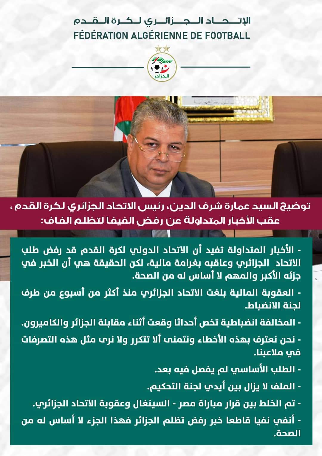 فجر رئيس الاتحاد الجزائري لكرة القدم شريف بن عمارة مفاجأة من العيار الثقيل بشأن شكوى الجزائر لإعادة مباراة الكاميرون.
