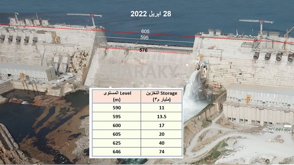 وتابع:" تأمل إثيوبيا حاليًا رفع مستوى الممر الأوسط بمقدار 20 م إلى المستوى الحقيقى 595م، والذى يعادل قدرة تخزينية 13.5 مليار م3 وليس 18.5 مليار م3 طبقا للجدول الهندسى الذى تم بواسطة الشركة الايطالية المنفذة، وبالتالى فان التخزين القادم سوف يتراوح بين 3 إلى 5.5 مليار م3 فى أحسن الأحوال. ومازال التخزين مرفوض من مصر والسودان بأى كمية.