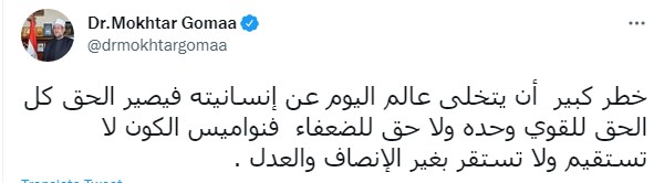 وكتب الدكتور محمد مختار جمعة تغريدة عبر تويتر "خطر كبير أن يتخلى عالم اليوم عن إنسانيته فيصير الحق كل الحق للقوي وحده ولا حق للضعفاء فنواميس الكون لا تستقيم ولا تستقر بغير الإنصاف والعدل".