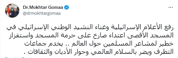 كما علق محمد مختار جمعة على رفع الأعلام الإسرائيلية وغناء النشيد الإسرائيلى فى المسجد الأقصى المبارك فقال "رفع الأعلام الإسرائيلية وغناء النشيد الوطني الإسرائيلي في المسجد الأقصى اعتداء صارخ على حرمة المسجد واستفزاز خطير لمشاعر المسلمين حول العالم.. يخدم جماعات التطرف ويضر بالسلام العالمي وحوار الأديان والثقافات."