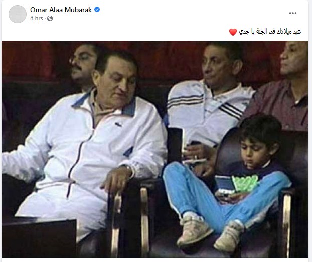وجه عمر علاء مبارك، حفيد الرئيس الراحل حسني مبارك، رسالة مؤثرة لروح جده في ذكري ميلاده الـ94، قائلًا إن عيد ميلاده في الجنة. وأرفقها بصورة له وهو طفل صغير مع جده الرئيس الراحل مبارك.