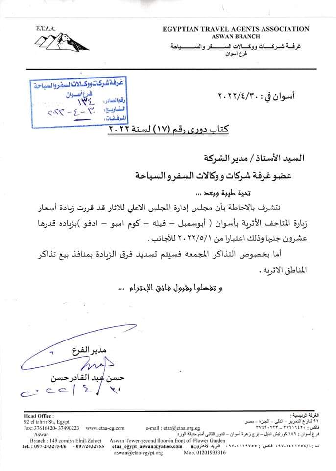 وقرر المجلس الأعلى للآثار زيادة أسعار تذاكر دخول الزائرين الأجانب بالمتاحف الأثرية بأسوان 20 جنيها وتشمل « أبوسمبل - فيله - كوم امبو -إدفو»، على أن يتم تسديد فرق زيادة التذاكر المجمعة بمنافذ بيع التذاكر بالمناطق الأثرية.