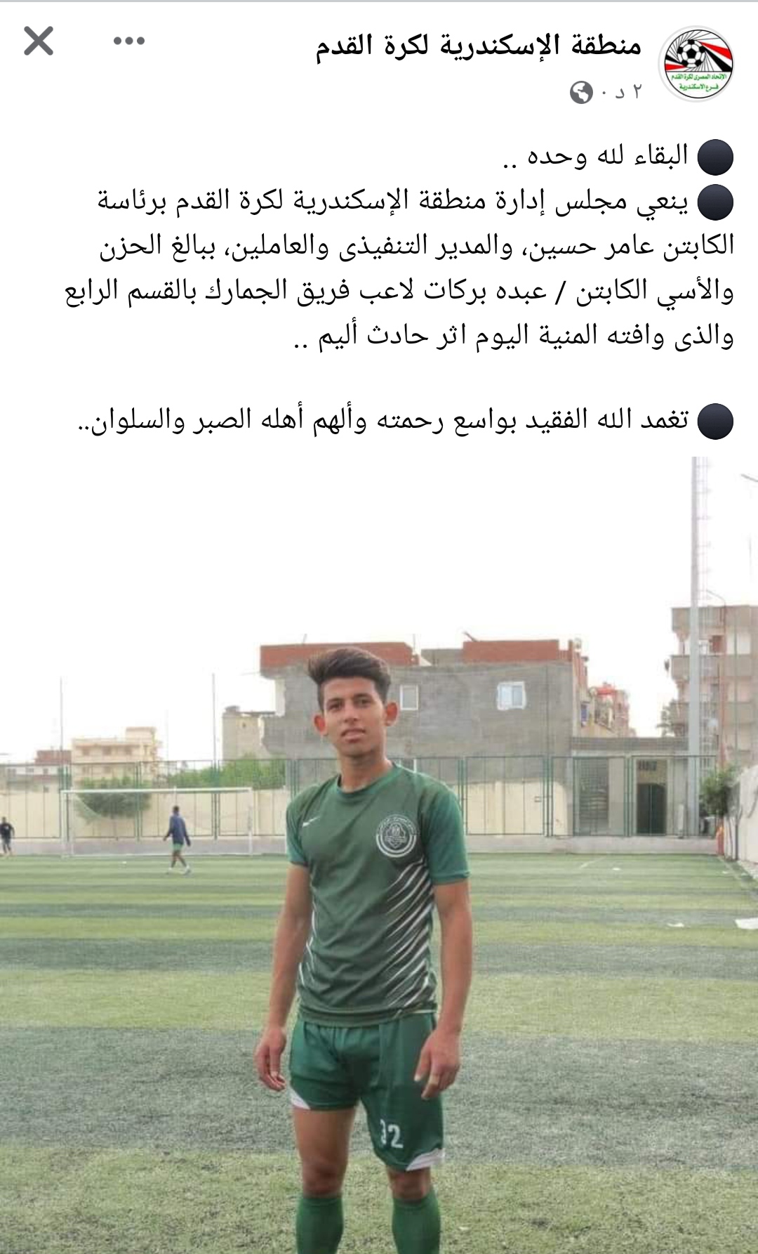 و نعي مجلس إدارة منطقة الإسكندرية لكرة القدم برئاسة الكابتن عامر حسين، والمدير التنفيذى والعاملين، ببالغ الحزن والأسي الكابتن عبده بركات لاعب فريق الجمارك بالقسم الرابع، والذى وافته المنية اليوم إثر حادث أليم.