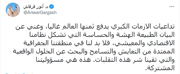 وكتب أنور قرقاش تغريدة على تويتر: "تداعيات الأزمات الكبرى يدفع ثمنها العالم غاليا، وغني عن البيان الطبيعة الهشة والحساسة التي تشكل نظامنا الاقتصادي والمعيشي، فلا بد لنا في منطقتنا الجغرافية الممتدة من التعايش والتسامح والبحث عن الحلول الواقعية والتي تقينا شر هذه التقلبات. هذه هي مسؤوليتنا المشتركة."