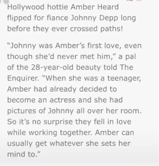 وأكدت آمبر للمحكمة آنها لم تكن تعرف جوني ديب،ليست معجبة به، ولم يكن لها أي اهتمام نحوه، وأن هو من طاردها، وبالرجوع إلي مقابلات آمبر هيرد الصحفية القديمة، نجد أنها صرحت بأنها كانت من معجبينه وكانت بتعلق بوستراته وصوره في غرفتها، وأنه كان حبها الأول منذ الطفولة".