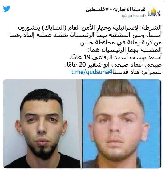 أعلنت شرطة الاحتلال الإسرائيلي صباح اليوم الجمعة، من قالت إنها حددت أسماء وصورة منفذي “عملية إلعاد” بتل أبيب، التي حدثت مساء الخميس، وهما، أسعد الرافعي وصبحي شقير، من بلدة رمانة بجنين بالضفة الغربية.
