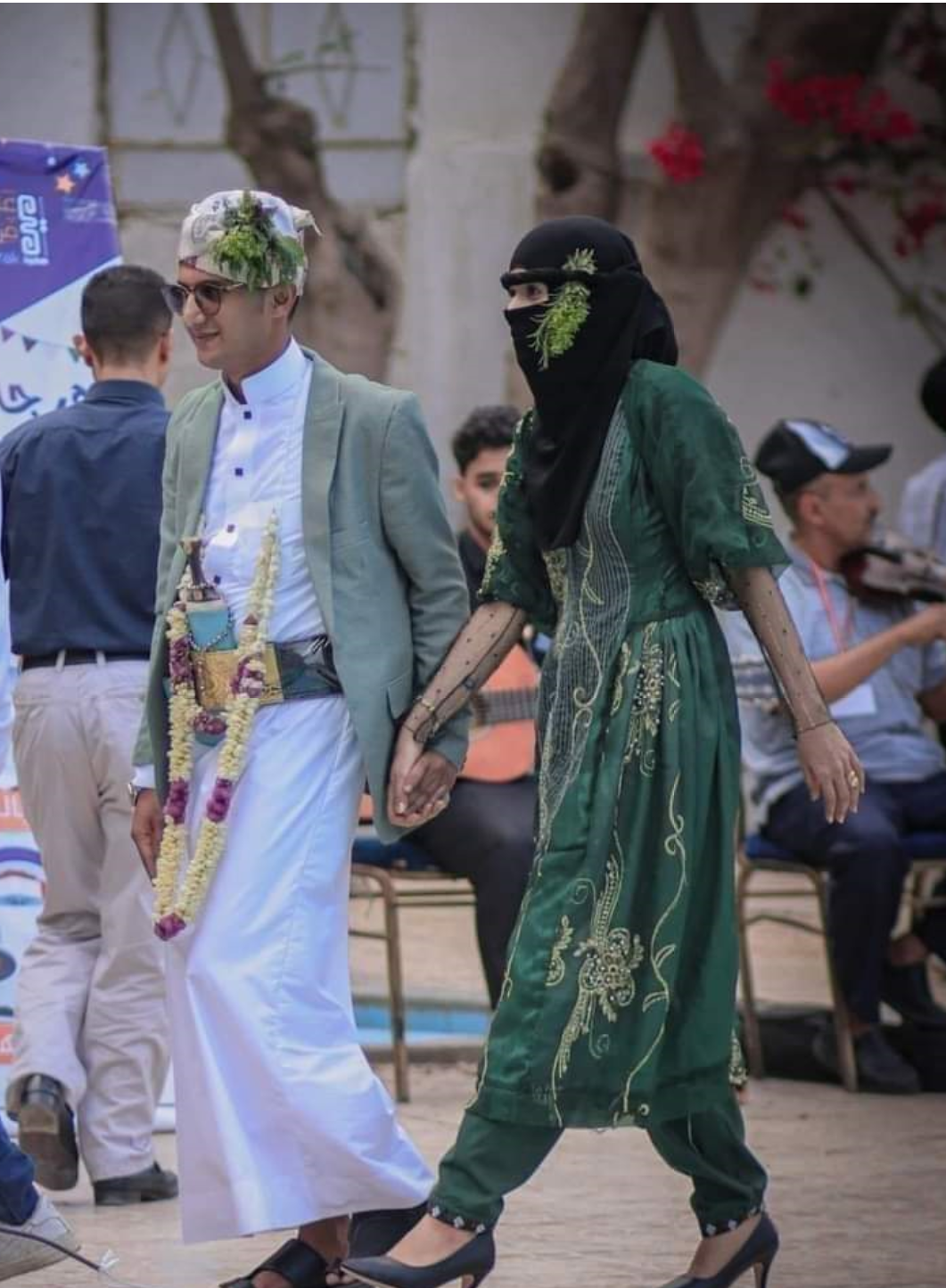 وكانت العروس الشابة هديل نجيب ترتدي فستانا تقليديًا أخضر مع غطاء للرأس والوجه وعلى رأسها المشاقر "ريحان"، إلى جانب عريسها عقبة عباس، الذي يرتدي كوتًا، ومشدة على رأسه وثوبا وخنجر يمان.