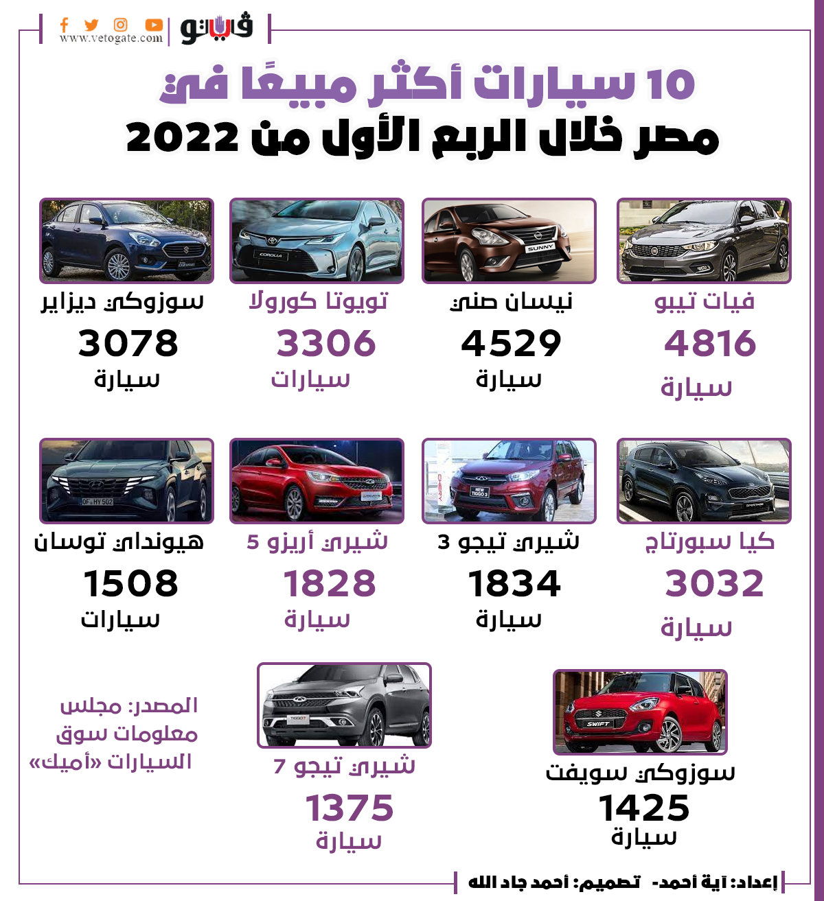 10 سيارات أكثر مبيعًا في مصر خلال الربع الأول من 2022 | انفوجراف السبت 07/مايو/2022 - 05:00 م 5/7/2022 5:00:35 PM 10 سيارات أكثر مبيعًا في مصر خلال الربع الأول من 2022 آية أحمد شارك طباعة 18 حجم الخط شارك طباعة السيارات سوق السيارات سيارات سوزوكي تويوتا كورولا فيات هيونداي توسان