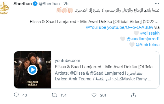كشفت الفنانة شريهان عبر حسابها الشخصي على موقع التغريدات الشهير "تويتر"، عن رأيها في أغنية "من أول دقيقة" للنجمة إليسا والمطرب سعد لمجرد، والتي تم طرحها على موقع يوتيوب تزامنا مع عيد الفطر المبارك.