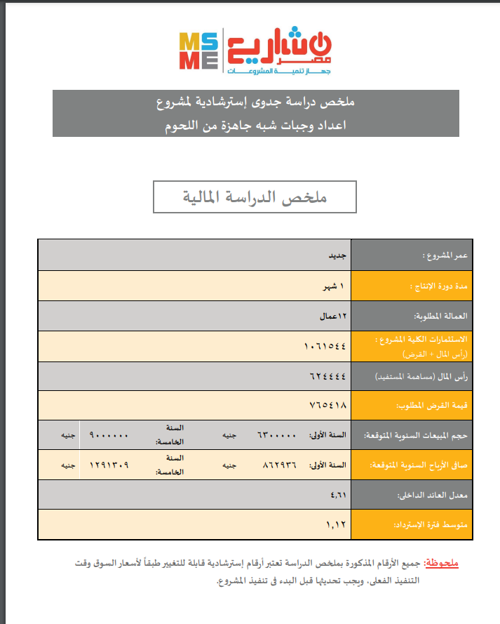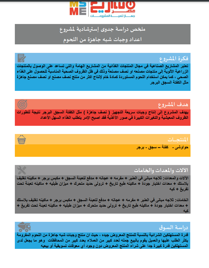 وتستعرض "فيتو" كافة التفاصيل المتعلقة بدراسة جدوى استرشادية لمشروع اعداد وجبات شبه جاهزة من اللحوم والتي أعدها جهاز تنمية المشروعات الصغيرة والمتوسطة خلال السطور التالية: