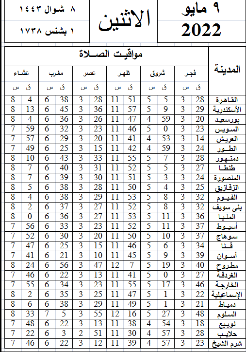 مواقيت الصلاة اليوم وفقًا للتوقيت المحلي لمدينتي القاهرة والإسكندرية وعدد من مدن ومحافظات الجمهورية: