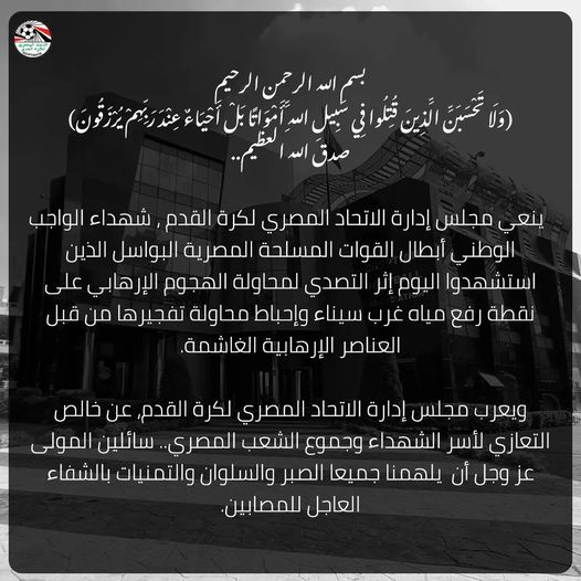 ينعي مجلس إدارة إتحاد الكرة المصري، شهداء الواجب الوطني أبطال القوات المسلحة المصرية البواسل الذين استشهدوا اليوم إثر التصدي لمحاولة الهجوم الإرهابي على نقطة رفع مياه غرب سيناء وإحباط محاولة تفجيرها من قبل العناصر الإرهابية الغاشمة.