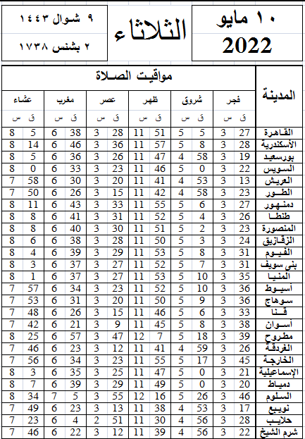 مواقيت الصلاة اليوم الثلاثاء 10-5-2022 في القاهرة والمحافظات