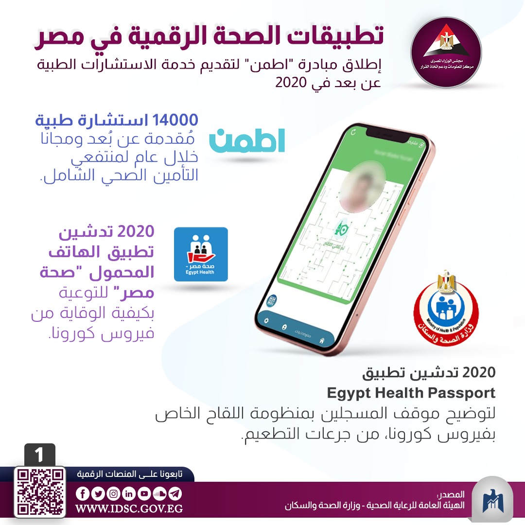 وفي 2020 أطلقت مصر مبادرة "اطمن" لتقديم خدمة الاستشارات الطبية عن بعد. وقد بلغ عدد الاستشارات الطبية ضمن تلك المبادرة المقدمة مجانًا وعن بُعد قرابة 14000 استشارة طبية لمنتفعي التأمين الصحي الشامل خلال عام.