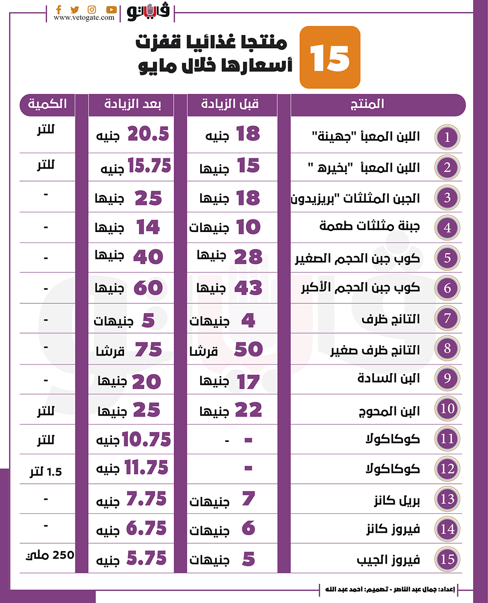 15 منتجا غذائيا قفزت أسعارها خلال مايو|إنفوجراف الإثنين 09/مايو/2022 - 11:44 ص 5/9/2022 11:44:51 AM مشروبات غازية جمال عبدالناصر شارك طباعة 18 حجم الخط شارك طباعة المواد الغذائية كوكاكولا اللبن المعبأ الزبادى المشروبات الغازية اللبن المعب مواد الغذائية