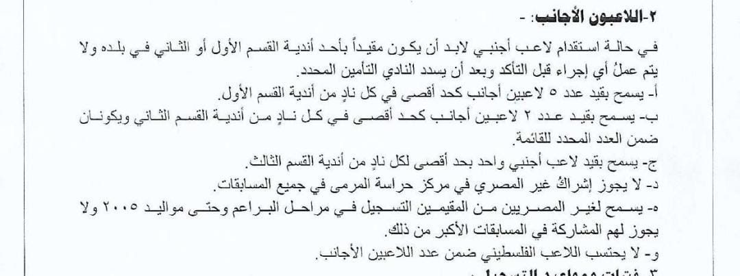 وتنص لائحة المسابقات لاتحاد الكرة هذا الموسم على السماح لكل ناد بالتعاقد مع 5 محترفين مع الوضع في الاعتبار أن اللاعب الفلسطيني يعامل معاملة اللاعب المصري حيث تضم البطولة 7 لاعبين من فلسطين.