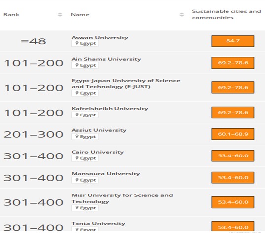 وفى الهدف الحادى عشر مدن ومجتمعات محلية مستدامة، جاءت الجامعة في المستوي (301-400) علي مستوي العالم، أما الهدف الخامس: المساواة بين الجنسين:جاءت الجامعة في المستوي (401-600) علي مستوي العالم وتشاركت الجامعة هذا المستوي مع عدد كبير من الجامعات المصرية مثل جامعة الاسكندريه، الجامعة الامريكية، جامعة القاهرة، اسيوط وغيرها، وجاء ترتيب الجامعة الـ 14 بين الجامعات المصرية، وفى هدف القضاء على الفقر جاءت الجامعة في المستوي (401-600) علي مستوي العالم، وتشاركت الجامعة هذا المستوي مع عدد كبير من الجامعات المصرية وجاء ترتيب الجامعة الـ 17 بين الجامعات المصرية.