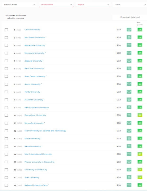وأوضح أنه ارتفع أيضا ترتيب الجامعة في معيار مخرجات الابتكار عدد 90 مركزا مقارنه بعام 2021، اما في معيار الاثر المجتمعي فقد ارتفع ترتيب الجامعة مركزين فقط، لافتا إلى أن الدكتور خالد عبدالغفار وزير التعليم العالى والبحث العلمى، كان قد أعلن في شهر مارس الماضى عقد شراكة وزارة التعليم العالي والبحث العلمي فى مصر مع هذا المصنف العالمي ( Scimago) والسيفير Elsevier في إطلاق منصة تصنيف للمراكز البحثية بالشرق الأوسط وشمال إفريقيا.