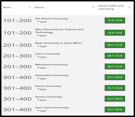 وتقدمت جامعة مصر للعلوم والتكنولوجيا في تصنيف التايمز البريطانى بعدد خمسة أهداف من أهداف التنمية المستدامة وهى القضاء على الفقر، والصحة الجيدة والرفاهية، والمساواة بين الجنسين، ومدن ومجتمعات محلية مستدامة، وعقد الشراكات لتحقيق الاهداف، وجاء ترتيب الجامعة في الهدف الثالث: الصحة الجيدة والرفاهية في المستوي (101-200) علي مستوي العالم، وتشاركت جامعة مصر للعلوم والتكنولوجيا هذا المستوي فقط مع جامعة عين شمس لتحصل الجامعة علي المركز التاني بين الجامعات المصرية، أما الهدف السابع عشر وهو عقد الشراكات لتحقيق الاهداف فجاءت الجامعة في المستوي (301-400) علي مستوي العالم