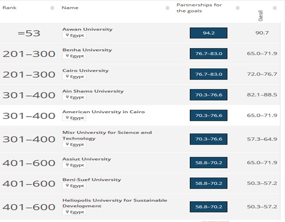 كما حققت جامعة مصر ترتيبا متميزا فى تصنيف التايمز البريطاني للتنمية المُستدامة لعام 2022، ولأول مرة يتم ادراج الجامعة بهذا التصنيف، حيث جاءت فى المستوى (601-800) على مستوى العالم فى اجمالى التصنيف، حيث أدرج التصنيف هذا العام عدد 1406 جامعة من 106 دولة، كما احتلت الجامعة الترتيب رقم 17 من اجمالي 36 جامعة مصرية شاركت في تصنيف 2022، ويقوم المصنف بترتيب الجامعات العالمية وفقا لتحقيقها أهداف الأمم المتحدة للتنمية المُستدامة لعام 2022 والبالغ عددها سبعة عشر هدفًا، طبقا لاجمالي الاداء العام للجامعة، كما يقوم المصنف بترتيب الجامعات طبقا لادائها بكل هدف منفرد من اهداف الاستدامة السبعة عشر.