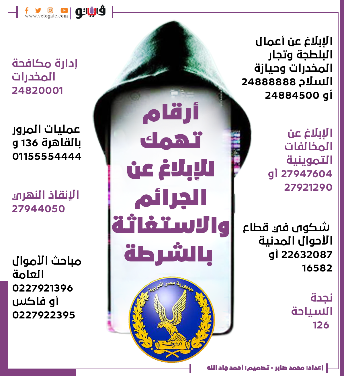 أرقام تهمك للإبلاغ عن الجرائم والاستغاثة بالشرطة | إنفوجراف الثلاثاء 10/مايو/2022 - 11:40 ص 5/10/2022 11:40:39 AM وزارة الداخلية محمد صابر شارك طباعة 18 حجم الخط شارك طباعة الاحوال المدنية وزارة الداخلية الحالات الانسانية بطاقات الرقم القومى استخراج الوثائق وثائق الأحوال المدنية المخالفات التموينية