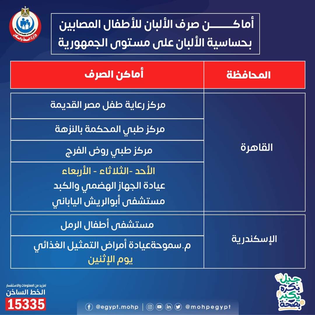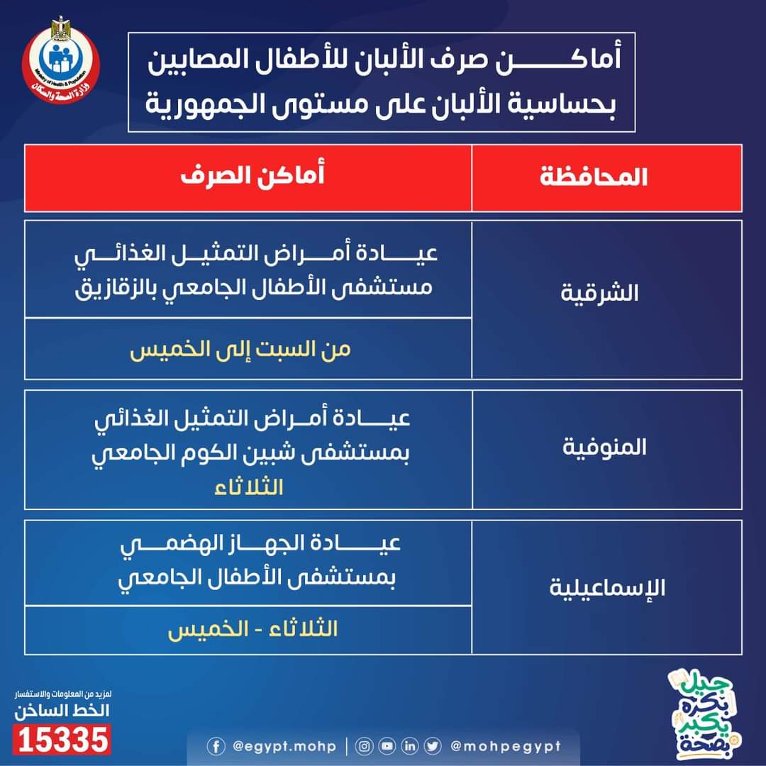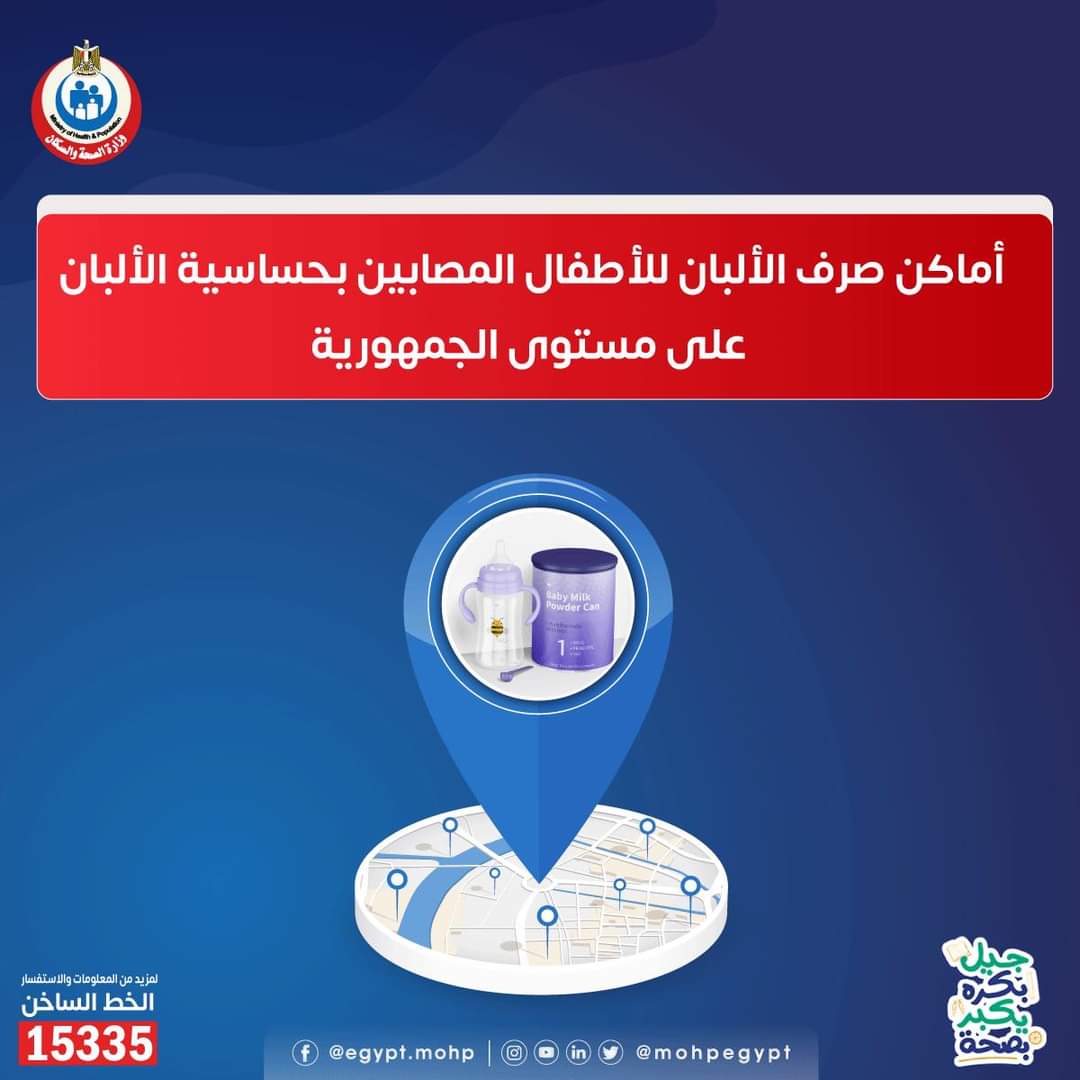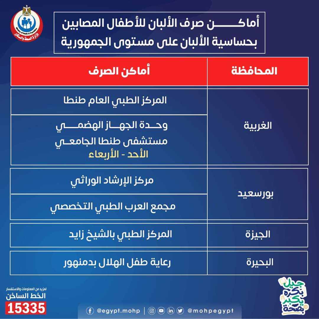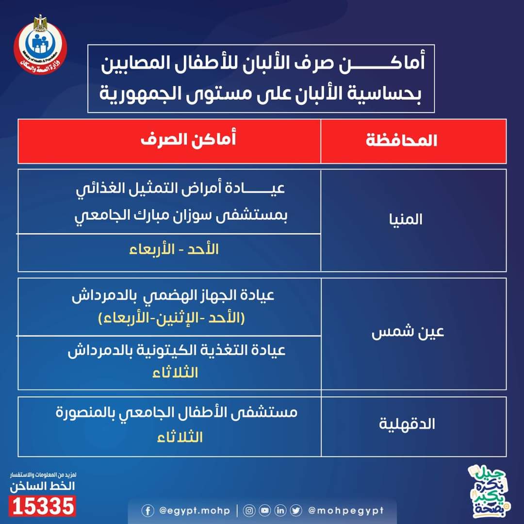 أعلنت وزارة الصحة عناوين أماكن صرف الألبان على مستوى الجمهورية، للأطفال المصابين بحساسية الألبان وكذلك مواعيد الصرف للأطفال.