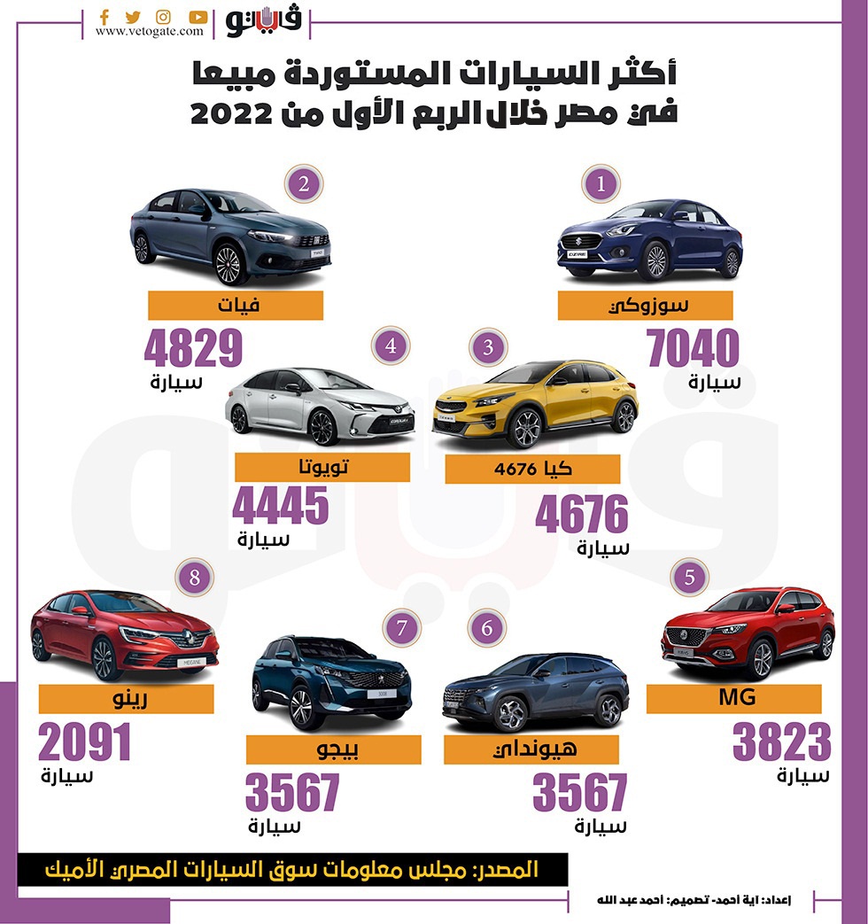 أكثر السيارات المستوردة مبيعا في مصر خلال الربع الأول من 2022| انفوجراف الأحد 22/مايو/2022 - 12:41 م 5/22/2022 12:41:08 PM السيارات آية أحمد شارك طباعة 18 حجم الخط شارك طباعة السيارات المستوردة السيارات سوق السيارات سيارات