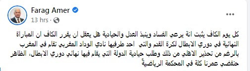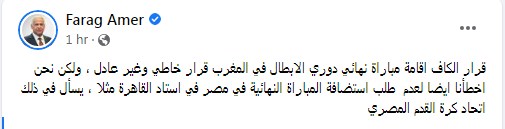 وكتب فرج عامر تدوينة على الفيس بوك "قرار الكاف اقامة مباراة نهائي دوري الابطال في المغرب قرار خاطئ وغير عادل، ولكن نحن اخطأنا ايضا لعدم طلب استضافة المباراة النهائية في مصر في استاد القاهرة مثلا، يسأل في ذلك اتحاد كرة القدم المصري"