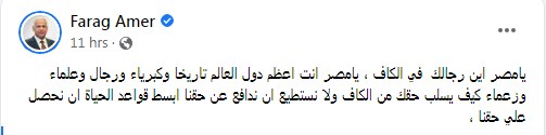 وقال في تدوينة سابقة "يامصر اين رجالك في الكاف، يامصر انت اعظم دول العالم تاريخا وكبرياء ورجال وعلماء وزعماء كيف يسلب حقك من الكاف ولا نستطيع ان ندافع عن حقنا ابسط قواعد الحياة ان نحصل علي حقنا"