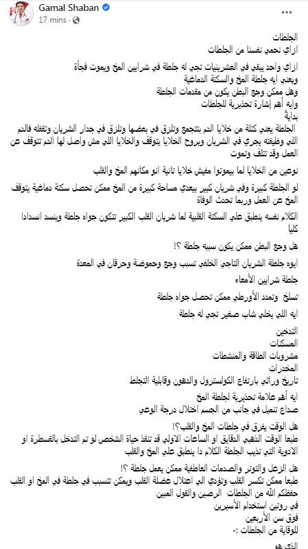 وكتب الدكتور جمال شعبان تدوينة على الفيس بوك "إزاي نحمي نفسنا من الجلطات.. إزاي واحد يبقي في العشرينيات تجي له جلطة في شرايين المخ ويموت فجأة.. ويعني ايه جلطة المخ والسكتة الدماغية.. وهل ممكن وجع البطن يكون من مقدمات الجلطة.. وايه أهم إشارة تحذيرية للجلطات"