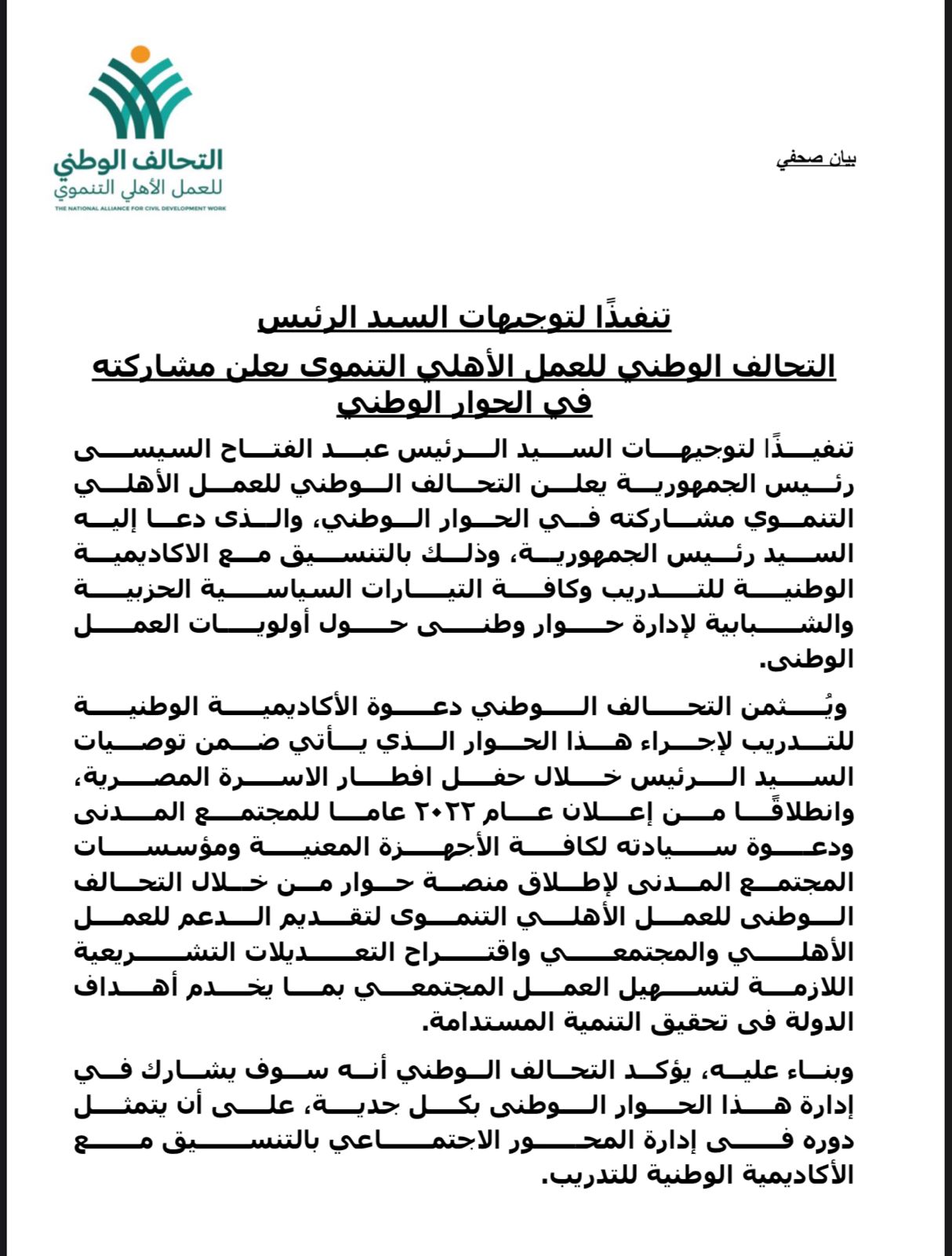 وبناء عليه، يؤكد التحالف الوطني أنه سوف يشارك في إدارة هذا الحوار الوطني بكل جدية، على أن يتمثل دوره فى إدارة المحور الاجتماعي بالتنسيق مع الأكاديمية الوطنية للتدريب.