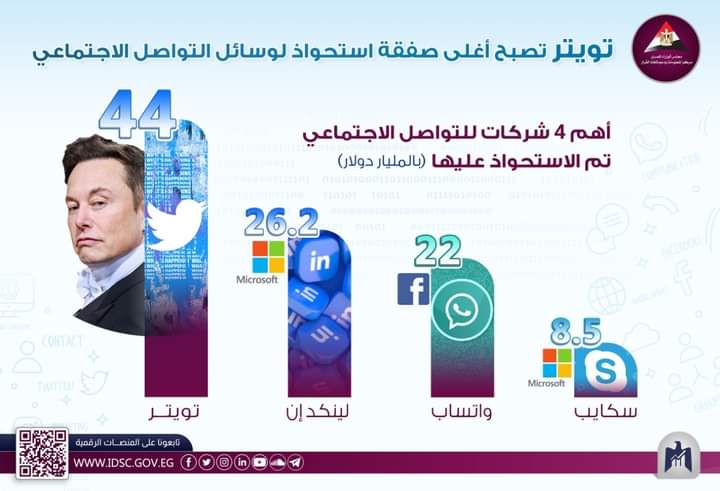 نشر مركز المعلومات ودعم اتخاذ القرار بمجلس الوزراء إنفوجراف جديد تحت عنوان "أهم 4 شركات للتواصل الاجتماعي تم الاستحواذ عليها".