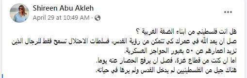 وكانت آخر وصية وأمنية لشيرين أبو عاقلة، والتي دونتها على حسابها بالفيس بوك في 29 أبريل 2022، أن يصلي كل فلسطيني للتمكن من رؤية القدس، حيث كتبت تدوينة قالت فيها: "هل أنت فلسطيني من أبناء الضفة الغربية؟ صل أن يمد الله في عمرك كي تتمكن من رؤية القدس، فسلطات الاحتلال تسمح فقط للرجال الذين تزيد أعمارهم عن ٥٠ عاما بعبور الحواجز العسكرية. أما إن كنت من قطاع غزة، فصل أن يرفع الحصار عنه يوما. هناك جيل من الفلسطينيين لم يدخل القدس ولم يرها في حياته".