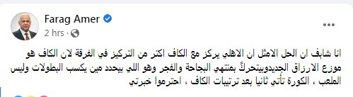 وكتب فرج عامر تدوينة على الفيس بوك:"انا شايف ان الحل الامثل ان الاهلي يركز مع الكاف اكتر من التركيز في الفرقة لان الكاف هو موزع الارزاق الجديد وبيتحركً بمنتهي ……… وهو اللي بيحدد مين يكسب البطولات وليس الملعب، الكورة تأتي ثانيا بعد ترتيبات الكاف، احترموا خبرتي".