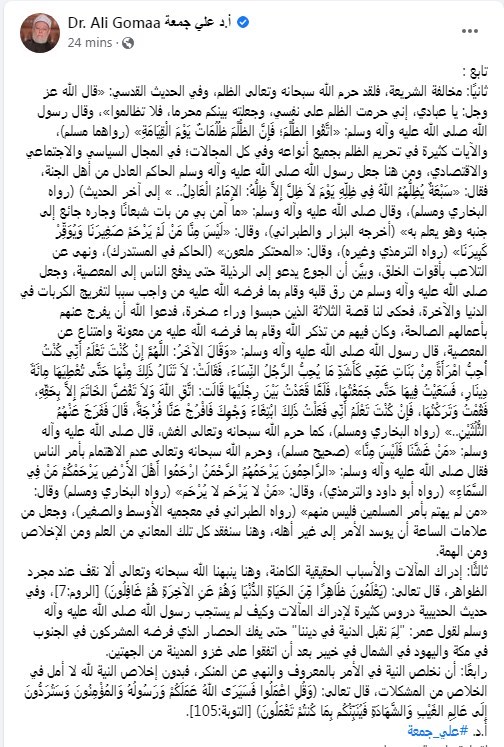وكتب الدكتور علي جمعة تدوينة على الفيس بوك "ثانيًا: مخالفة الشريعة، فلقد حرم الله سبحانه وتعالى الظلم، وفي الحديث القدسي: «قال الله عز وجل: يا عبادي، إني حرمت الظلم على نفسي، وجعلته بينكم محرما، فلا تظالموا»، وقال رسول الله صلى الله عليه وآله وسلم: «اتَّقُوا الظُّلْمَ؛ فَإِنَّ الظُّلْمَ ظُلُمَاتٌ يَوْمَ الْقِيَامَةِ» (رواهما مسلم)، والآيات كثيرة في تحريم الظلم بجميع أنواعه وفي كل المجالات؛ في المجال السياسي والاجتماعي والاقتصادي، ومن هنا جعل رسول الله صلى الله عليه وآله وسلم الحاكم العادل من أهل الجنة، فقال: «سَبْعَةٌ يُظِلُّهُمُ اللهُ فِي ظِلِّهِ يَوْمَ لاَ ظِلَّ إِلاَّ ظِلُّهُ: الإِمَامُ الْعَادِلُ.. » إلى آخر الحديث) (رواه البخاري ومسلم)