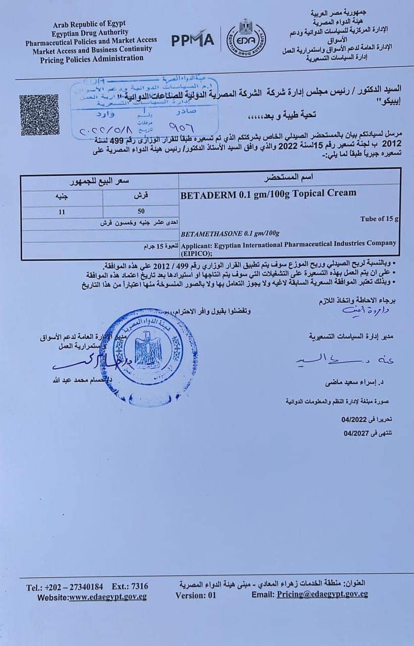 ويستخدم مستحضر بيتاديرم كريم لعلاج الأمراض الجلدية والطفح الجلدي.