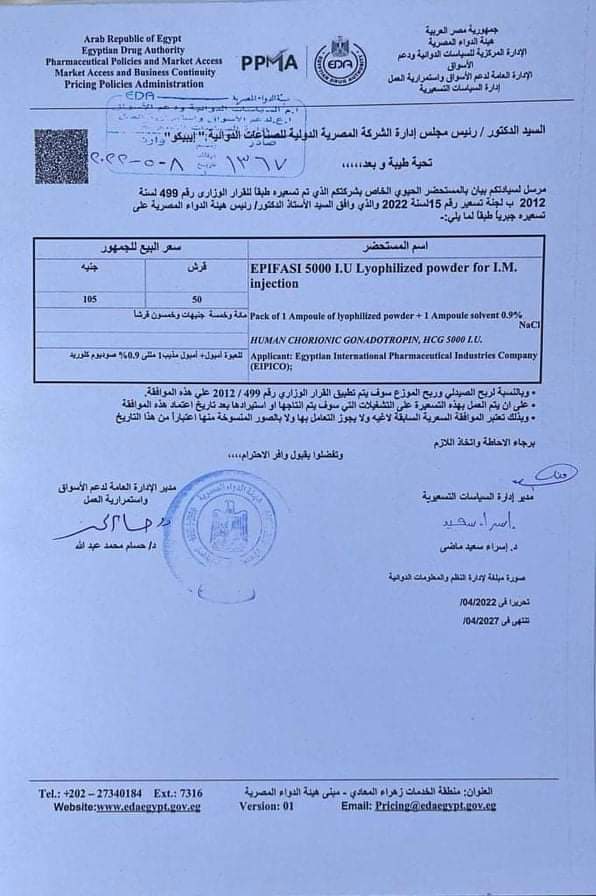 حقن منشطة للتبويض تساعد على الحمل وتم زيادة سعرها إلى 105 جنيهات للعبوة التي تحتوي على حقنة واحدة.
