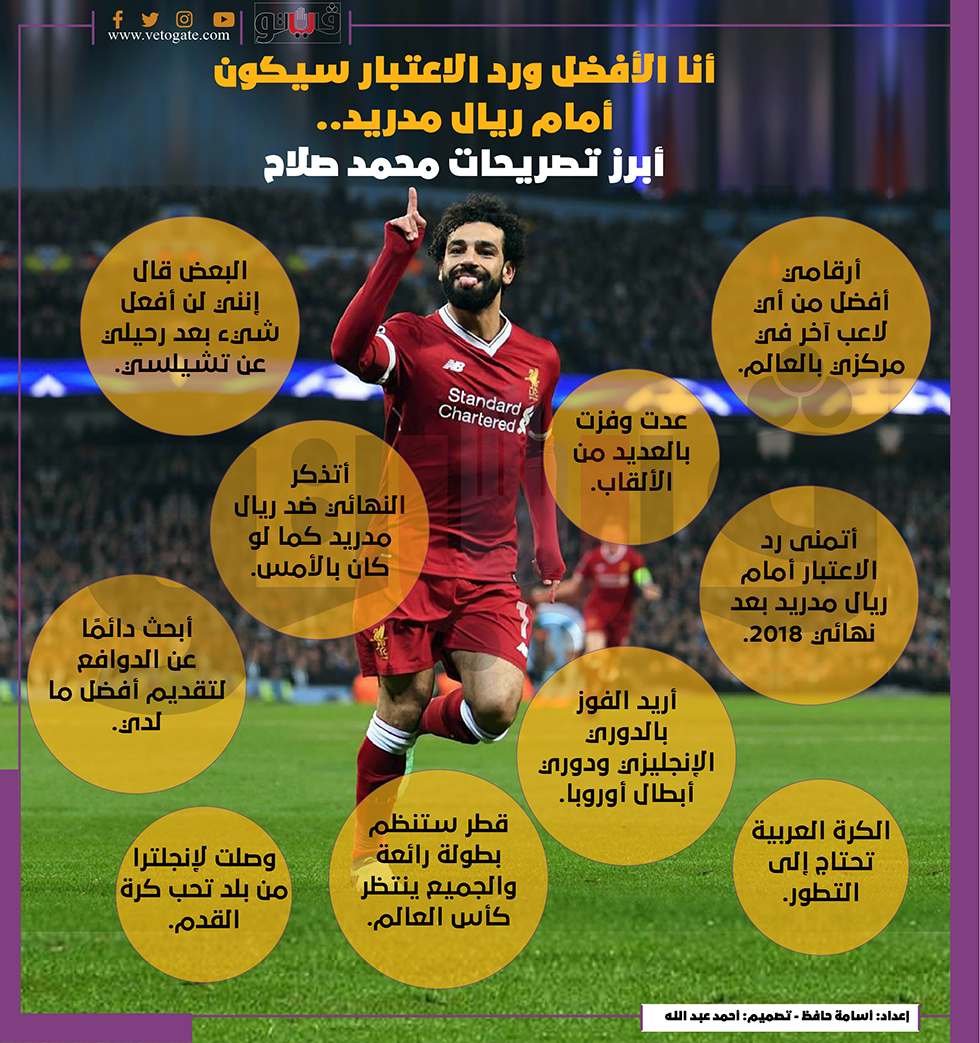 أنا الأفضل ورد الاعتبار سيكون أمام ريال مدريد.. أبرز تصريحات محمد صلاح | إنفوجراف الأربعاء 11/مايو/2022 - 08:00 م 5/11/2022 8:00:06 PM محمد صلاح اسامة حافظ شارك طباعة 18 حجم الخط شارك طباعة الدوري الانجليزي أوروبا الفرعون المصري دوري ابطال اوروبا ودوري أبطال أوروبا