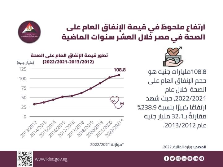 وتجدر الإشارة إلى أن الإنفاق العام على الصحة وصل إلى أعلى مستوى له في السنوات العشرة الأخيرة حيث وصل إلى 108.8 مليار جنيه في 2021/2022 مقارنة بـ 32.1 مليار جنيه في2012/2013.
