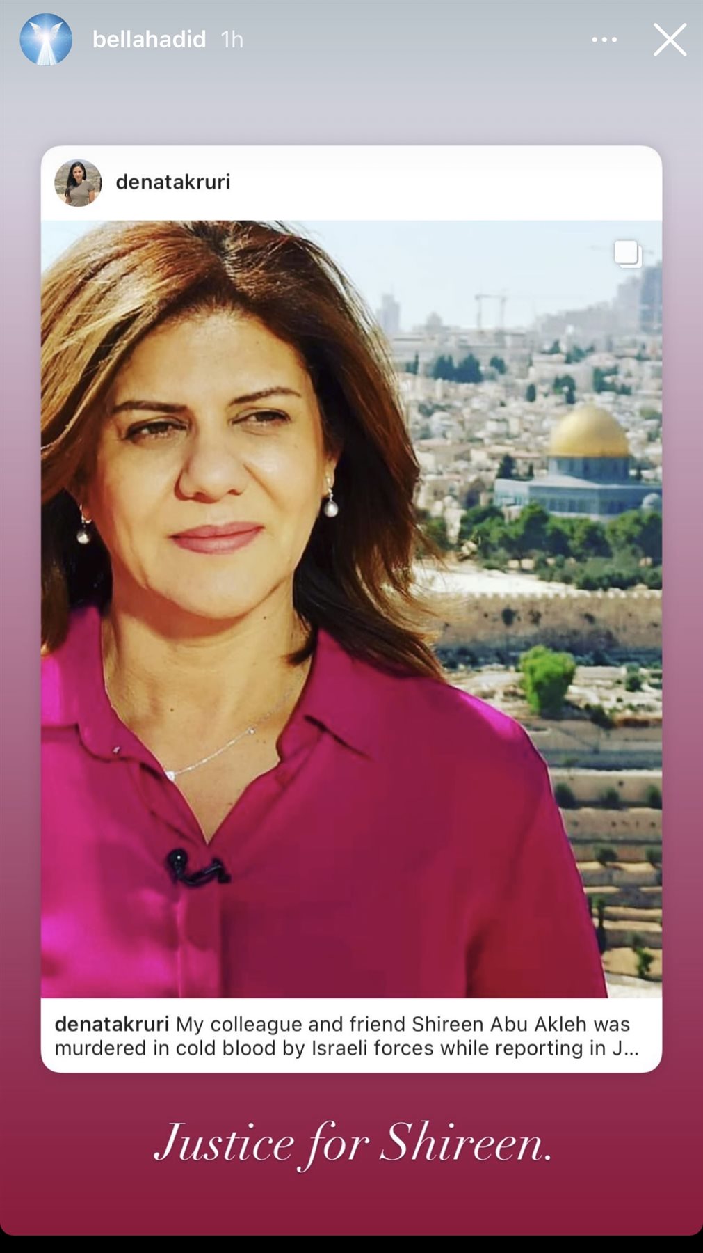 شاركت عارضة الأزياء العالمية بيلا حديد في نعي صحفية الجزيرة شيرين أبو عاقلة، وذلك عبر حسابها الرسمي على موقع الصور والفيديوهات إنستجرام، ونشرت بيلا صورة للصحفية الراحلة وأرفقتها بتعليق قائلة: "العدالة لشيرين أبو عاقلة".