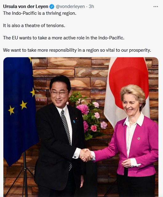 كما اعتبرت في تغريدة عبر حسابها على تويتر حول تلك القمة الأوروبية اليابانية الـ 28، أن اليابان كما الاتحاد الأوروبي تدرك أن مستقبل أوروبا برمته على المحك في الوقت الحالي وليس فقط أوكرانيا.