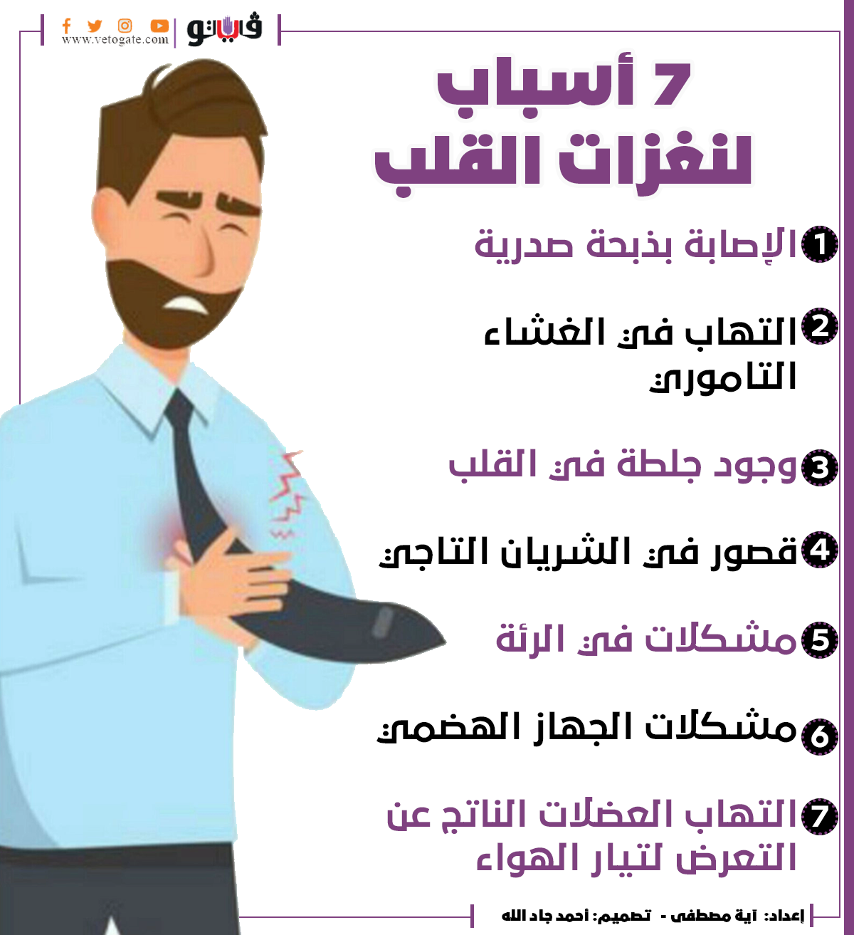 7 أسباب لنغزات القلب | إنفوجراف الجمعة 13/مايو/2022 - 01:41 م 5/13/2022 1:41:06 PM نغزات القلب آية مصطفى شارك طباعة 18 حجم الخط شارك طباعة الشريان التاجي الجهاز الهضمي انفوجراف العضلات جلطة الرئة