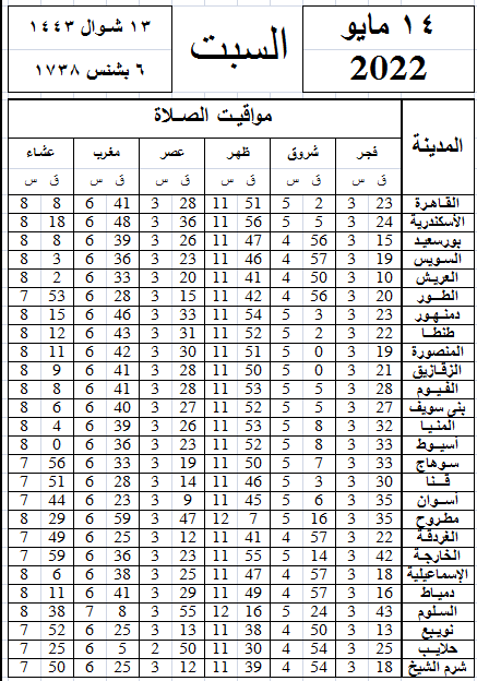 مواقيت الصلاة اليوم السبت 14-5-2022 في القاهرة والمحافظات