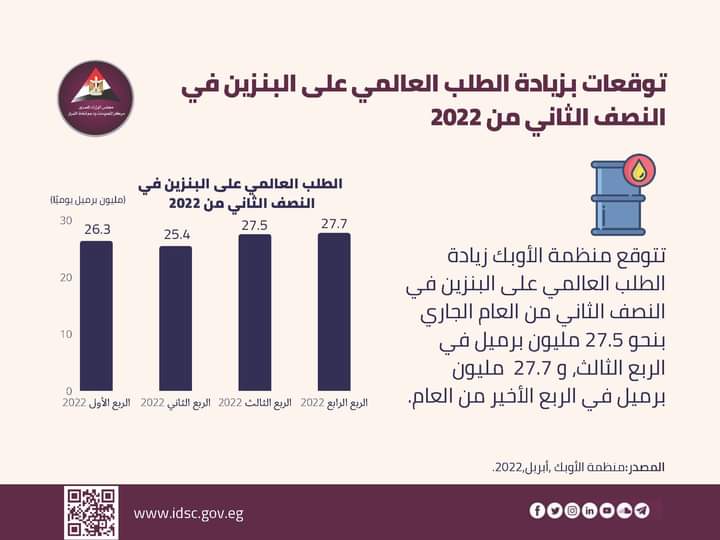 نشر مركز المعلومات ودعم اتخاذ القرار بمجلس الوزراء إنفوجراف جديدا تحت عنوان "توقعات بزيادة الطلب العالمي علي البنزين في النصف الثاني من 2022.