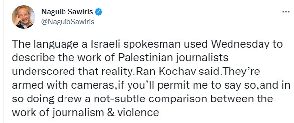 وكتب نجيب ساويرس تغريدة على تويتر: "إن اللغة التي استخدمها المتحدث الإسرائيلي، يوم الأربعاء، لوصف عمل الصحفيين الفلسطينيين أكدت هذه الحقيقة، حيث قال ران كوخاف إنهم مسلحون بالكاميرات، إذا سمحت لي بأن أقول ذلك، فإنك تقوم بإجراء مقارنة غير دقيقة بين عمل الصحافة والعنف".