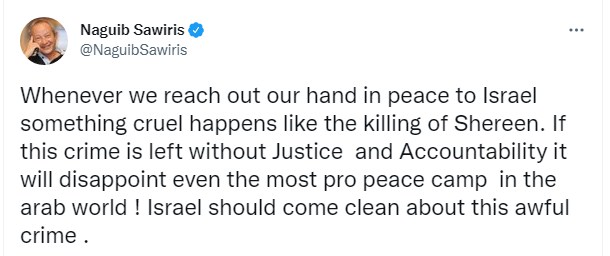 وقال: "كلما نمد أيدينا بالسلام إلى إسرائيل يحدث شيء قاسٍ مثل مقتل شيرين. إذا تُركت هذه الجريمة بدون محاسبة ومساءلة، فإنها ستخيّب أمل حتى أكثر معسكرات السلام في العالم العربي! يجب على إسرائيل أن تتبرأ من هذه الجريمة النكراء".