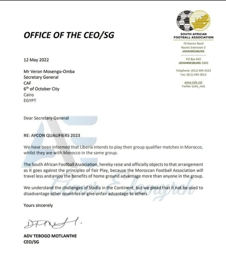 وقال اتحاد جنوب أفريقيا في خطاب رسمي للكاف: "علمنا أن ليبيريا تنوي خوض مبارياتها في تصفيات المجموعات في المغرب بينما هم مع المغرب في نفس المجموعة".