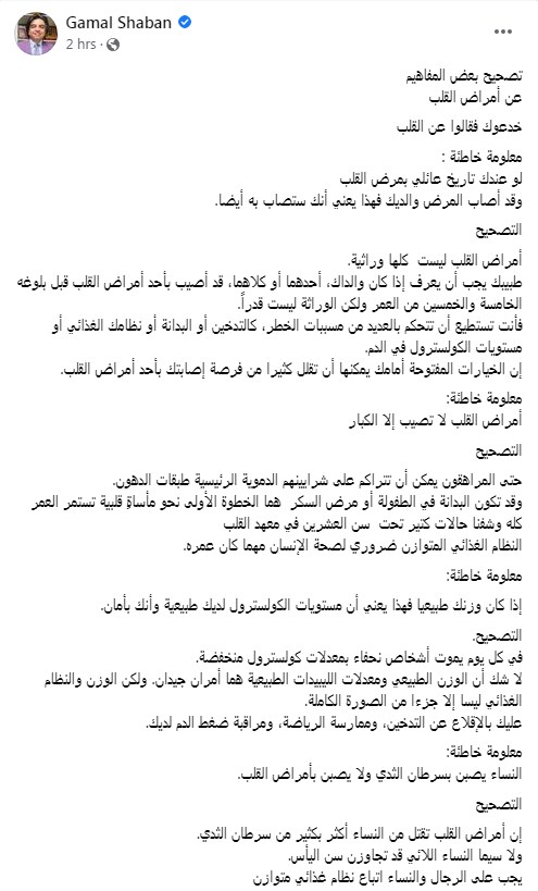 وكتب الدكتور جمال شعبان تدوينة على الفيس بوك "تصحيح بعض المفاهيم عن أمراض القلب خدعوك فقالوا عن القلب معلومة خاطئة: لو عندك تاريخ عائلي بمرض القلب وقد أصاب المرض والديك فهذا يعني أنك ستصاب به أيضا.. التصحيح أمراض القلب ليست كلها وراثية. طبيبك يجب أن يعرف إذا كان والداك، أحدهما أو كلاهما، قد أصيب بأحد أمراض القلب قبل بلوغه الخامسة والخمسين من العمر ولكن الوراثة ليست قدرًا."