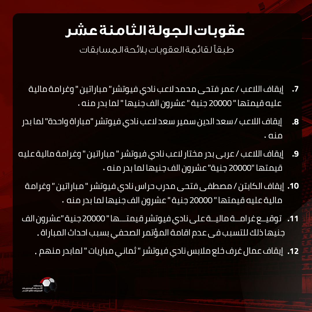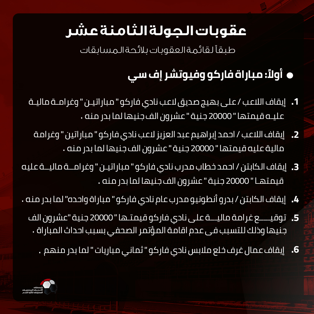 أعلنت رابطة الأندية المحترفة عقوبات الجولة الـ 18 لمسابقة الدوري الممتاز وأبرزها مباراة فاركو وفيوتشر.